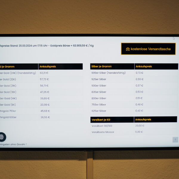 z.B. Schmuck bestehend aus Gold, Silber, Platin, Palladium, Ketten, Ringe, Ohrringe, Armbänder, Barren, Münzen, Bruchgold, Zahngold, Silberbesteck etc.